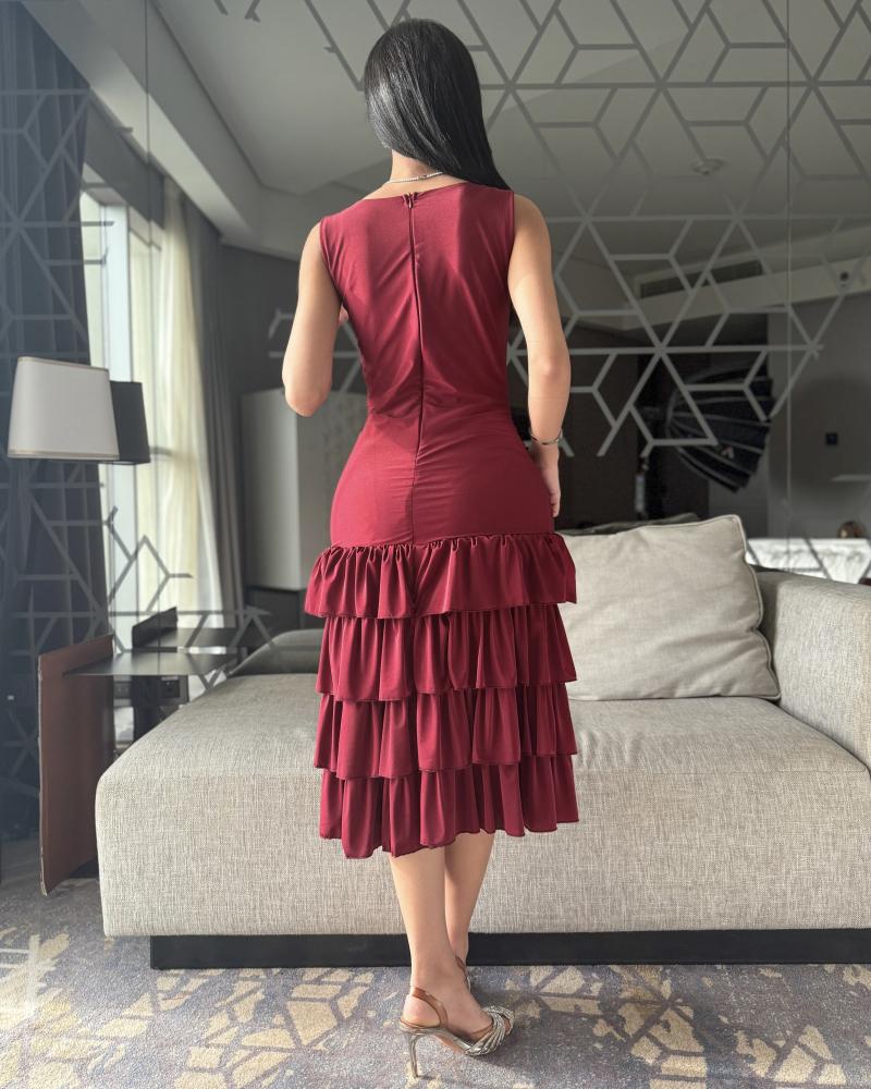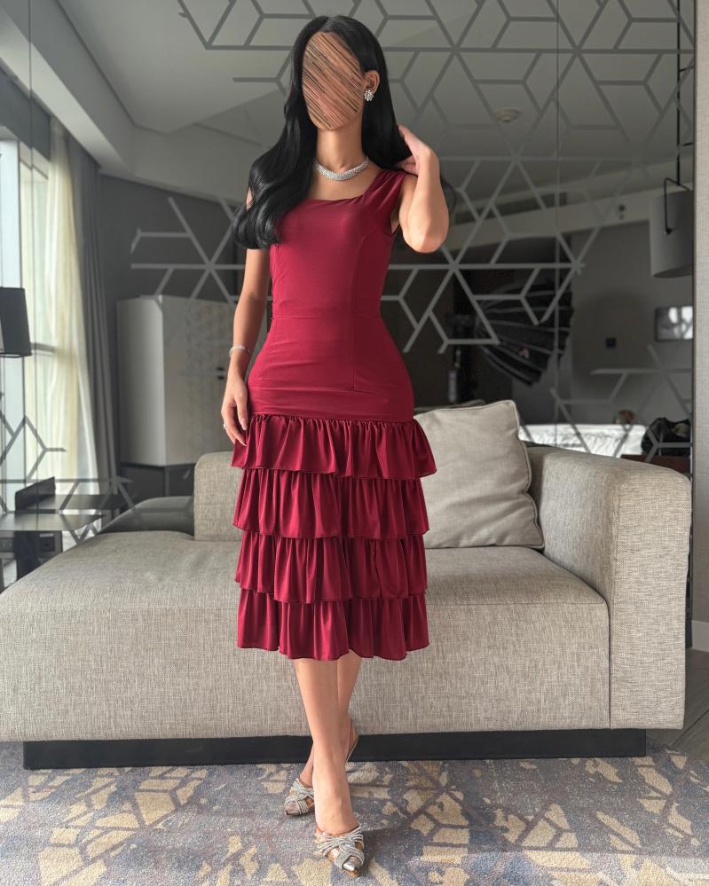 Burgundy dress The dress features a square neckline that highlights the beauty of the shoulders and neck. The lower part consists of multiple layers of ruffles, which gives the dress volume and movement. It is made of soft and flexible (Lycra fabric)